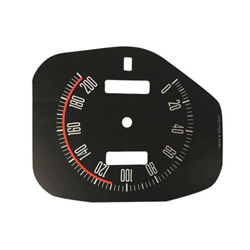 This speedometer black face overlay converts 120 mph round speedometers to kilometers. Adhesive backed overlay for easy installation.